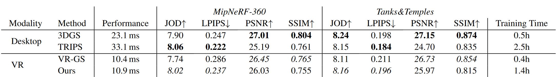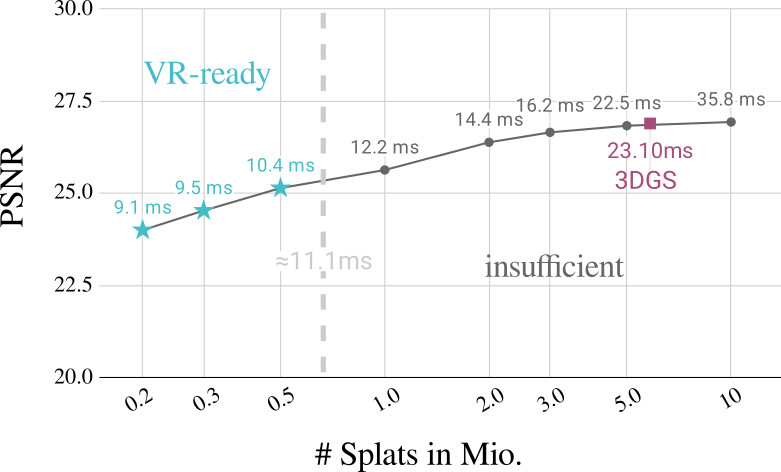 - VR requires very high (90Hz) framerates, thus only low number of Gaussians are possible as performance decreases with number of primitives.