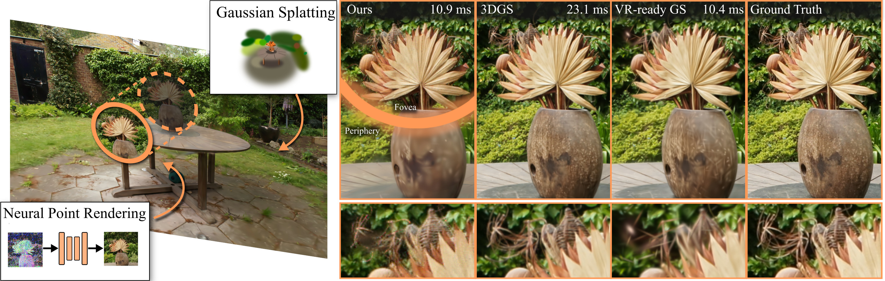 In the small time budget for the fovea, we can use neural point rendering (via TRIPS [Franke et al. 2024]) for crisper details.